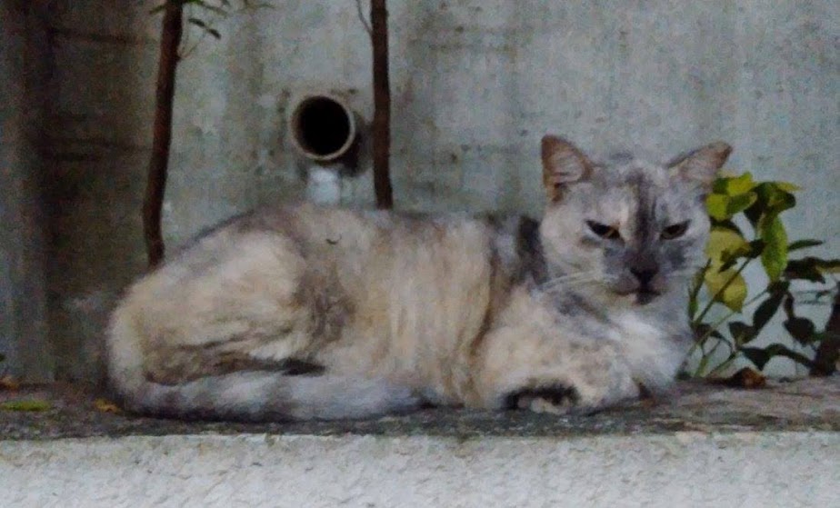 Years back, this beautiful silver cat used to be very skinny and pregnant.  After it was spayed, it got fat. But I never once saw her kittens. I wonder if they are aborted.  She's a well-known  smart cat who takes the lift up and down the 5-storey building.  Instead of climbing the stairs, she prefers to take the lift together with humans.
